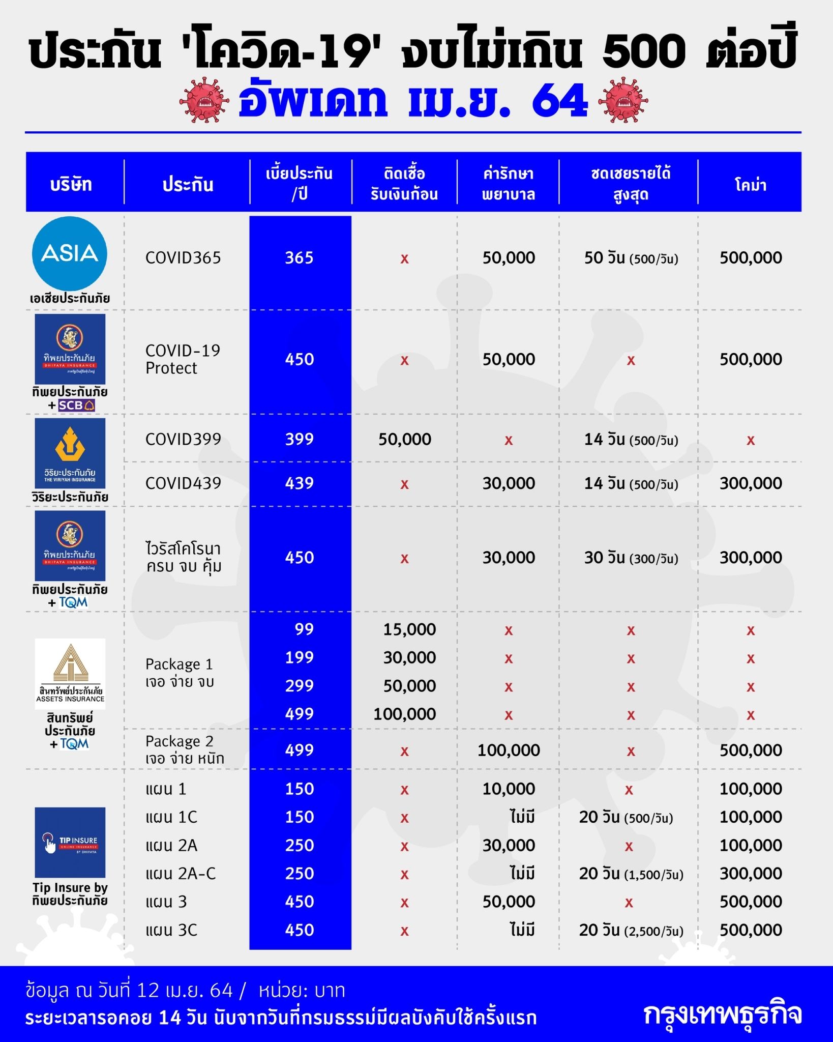 ประกน COVID-19 Protect ราคาเบยประกน 450 บาทป คมครองคารกษาพยาบาล 50000 บาท กรณโคมาคมครอง 500000 บาท แตจะไมจายเงนกอนกรณตรวจพบเชอโควด-19 และไมมเงนชดเชยรายไดตอวน. ลดการแพรระบาดของโควด-19 ดวยการใชชวตแบบการดไมตก พรอมเพมความอนใจ ดวยประกนโควด-19 เอเชยประกนภย จายเบยประกนเพยง 500 บาทตอป ไดรบความคมครองสงสด 500000. เอเชยยกเลกขายประกนโควด เจอ จาย จบ 500 บาทป เมอวนท 30 มถนายน 2564 เวลา 1630 น.