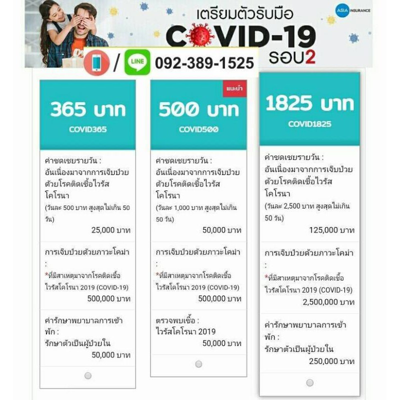 Asia Insurance รวมประก นโคว ด 19 จากเอเช ย แพ คไหนชอบแพ คไหนใช เล อกก นได เลย แผน เจอ จ าย ด แลต อ ว นละ 1 40 บาท เบ ย 500 ป ตรวจเจอเช อ ร บเลย 50 000 บาท ค มครองส งส ด 500 000 บาท ชดเชยรายได ว นละ 1 000 ว น